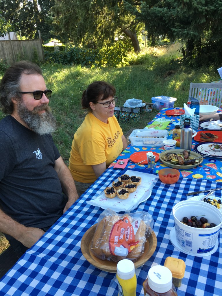 • A birthday party drew former and current OMC members together in a local pub to celebrate another year of living, loving and community making.  Almost every meeting, someone brings snacks, even warm peach pie!